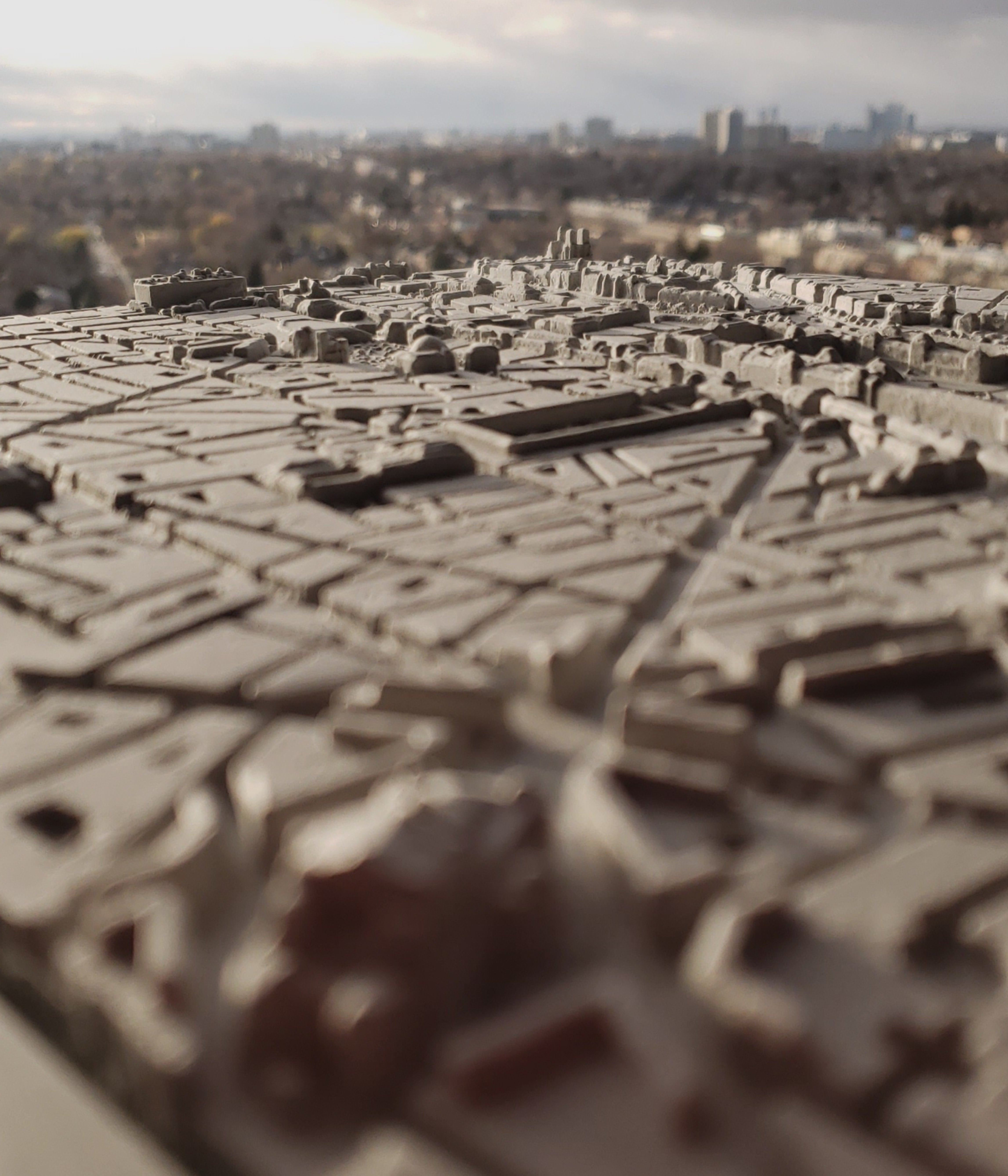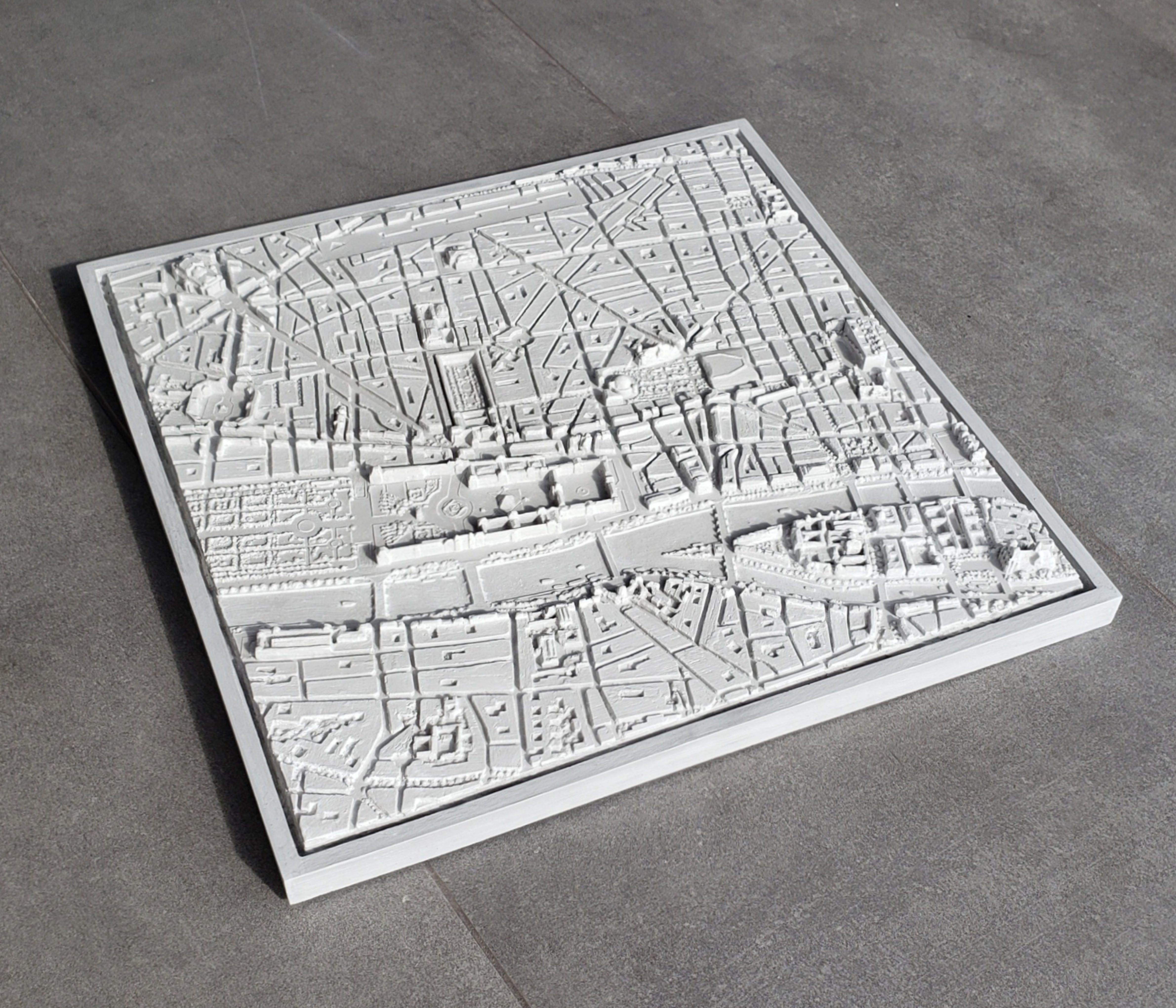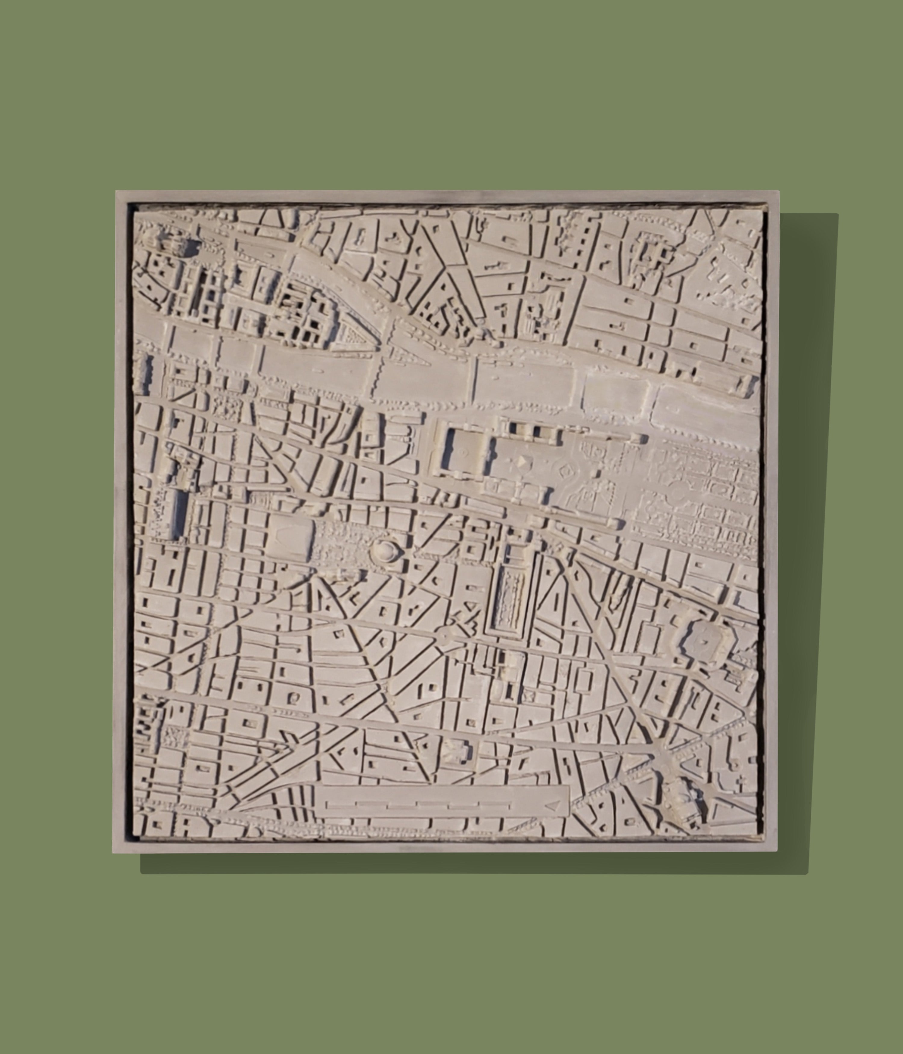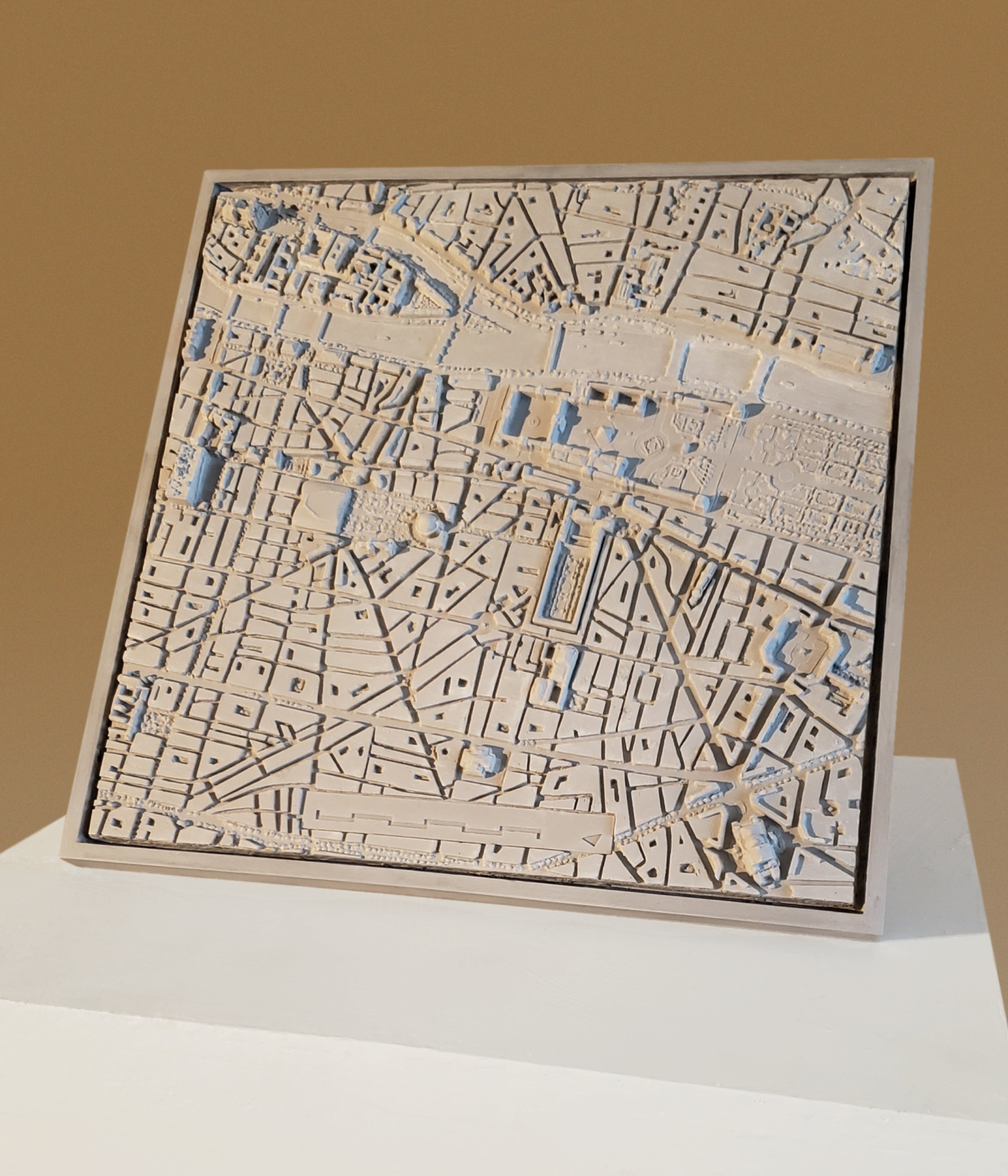 Through memories of central Paris – its buildings, monuments and tree-lined boulevards, I am reconstructing them on a prescribed horizon. By showing these architectonic elements in glorious three dimensionality whilst suppressing others, the work is a personal interpretation of the city.